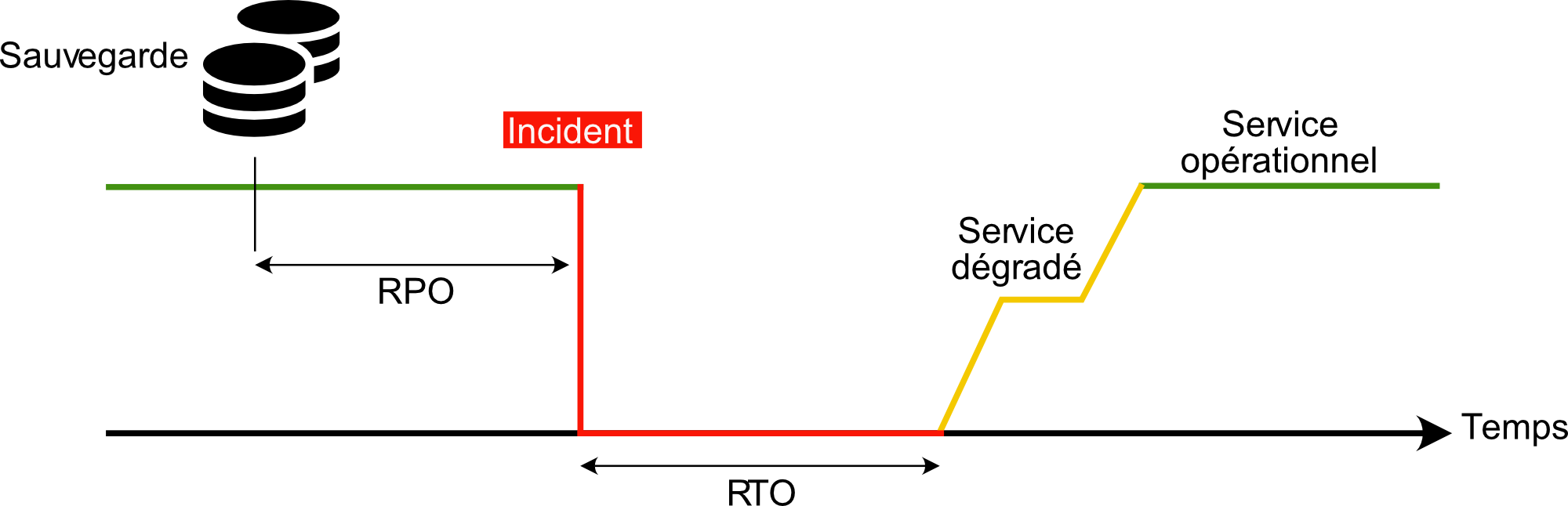 La perte de données maximale admissible, en anglais RPO quantifie les données qu’un système d’information peut être amené à perdre par suite d’un incident. Usuellement, elle exprime une durée entre l’incident / sinistre provoquant la perte de données et la date la plus récente des données qui seront utilisées en remplacement des données perdues. Cette durée est exprimée généralement en heures ou minutes.Le RPO est souvent déterminé par la fréquence et la nature des sauvegardes effectuées sur les ressources informatiques. Toutefois, les données utilisées en remplacement des données perdues ne proviennent pas nécessairement d’une sauvegarde/restauration. Elles peuvent par exemple être reconstruites à partir de journaux de transactions, être issues d’une réplication, d’une copie ou d’un rejeu différé…Tout comme le RTO, le RPO permet de faire comprendre qu’en cas de crash nous pouvons perdre des données, certains considèrent que c’est une perte d’intégrité, car les données ne seront plus “justes” avec la réalité, si nous prenons l’exemple des transactions bancaires l’impact serait terrible…C’est le cas typique où l’on devient paranoïaque et que l’on en arrive à du “ceinture, bretelles, épingle à nourrice, corde à linge, élastique …” c’est aussi pour cela que l’on voit que les bases de données transactionnelles ont de beaux jours devant elles, je vous invite à approfondir les quatre propriétés ACID qui est un acronyme résumant les quatre propriétés élémentaires d’une transaction au sein d’une base de données : Atomicité, Cohérence, Isolation, Durabilité. De par mon expérience j’ai déjà rencontré des DBA qui reconstruisent des données à partir des journaux de transaction des SGBD (Système de gestion de base de données) en cas de corruptions, il existe aussi des mécanismes intégrés aux SGBD pour contrôler et restaurer automatiquement la cohérence des données.